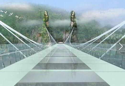 這座玻璃橋位于張家界大峽谷風景區(qū),橫跨栗樹埡和吳王坡兩座山頭,總長430米、寬6米,橋面距離谷底相對高度約300米。大橋為斜拉空間懸索結構,底面為鋼骨架。從2012年年底公布該大橋的初步設計方案后,國內外就十分關注這座以玻璃為主受力結構的大橋。