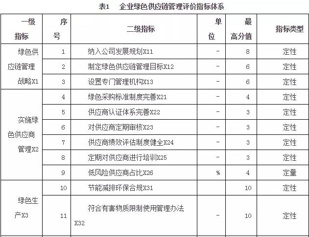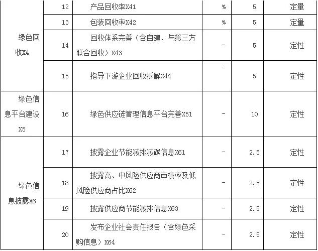 特別是《綠色供應鏈管理評價要求》(以下簡稱《評價要求》),是首個對企業綠色供應鏈管理進行規范指導的文件,《評價要求》著眼于產品全生命周期,對涉及綠色供應鏈管理的五個關鍵環節(確立可持續的綠色供應鏈管理戰略、實施綠色供應商管理、強化綠色生產、建設綠色回收體系、搭建綠色信息收集監測披露平臺)進行了詳細的闡述和要求,并建立了由六個一級指標、二十個二級指標組成的企業綠色供應鏈管理評價指標體系,引導企業在綠色供應鏈建設過程中進行自評價。指標體系和表1所示。