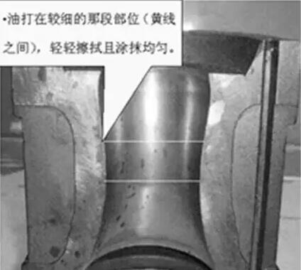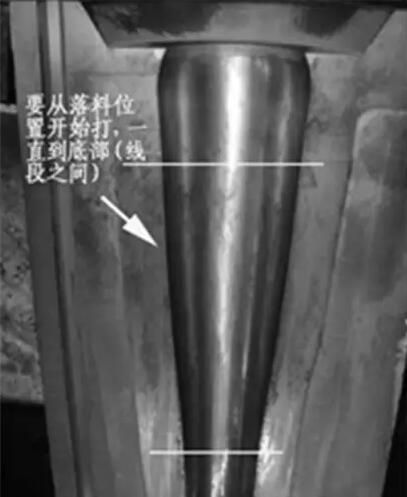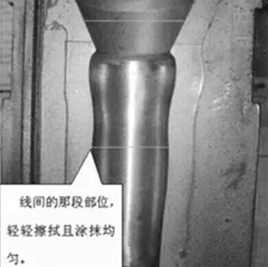 h初模吹-吹法涂刷涂料部位: 要從落料位(模具內腔2/3處即撲氣線處)開始涂料,一直到底部都要均勻涂刷涂料(圖1)。