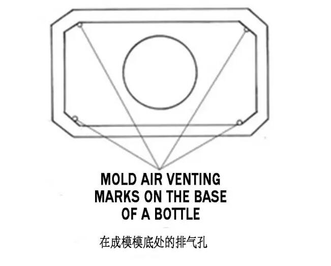 因?yàn)椴A吭谡禋獯抵茣r(shí),瓶底四角的成形是較后的,因此在這類玻璃瓶瓶底四角也要打排氣孔,如圖十。