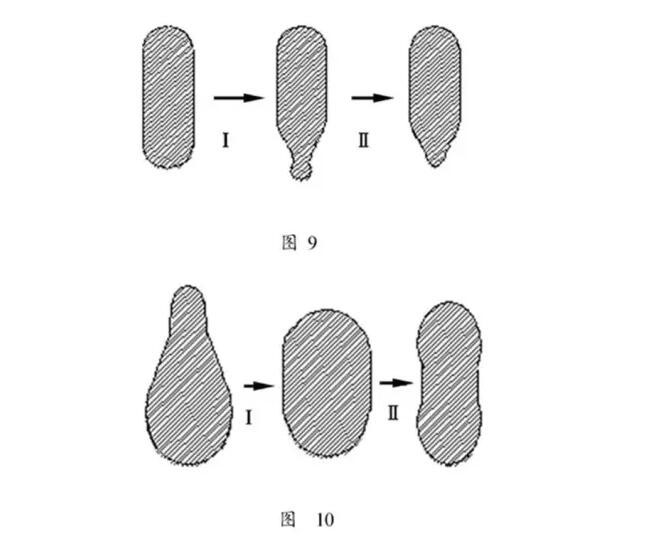 如圖4以單滴勻料筒順時針旋轉為例,下層玻璃先流入左側,中層玻璃液流入中間,上層玻璃液則流入右側.而雛形呈圖5示,則可推斷左側溫度較右側低;可調升冷卻段溫度或調降均化段溫度,依實際制瓶溫度調節將雛形作正作型.不要輕易忽視,要記住先天不正后天不良致理名言。