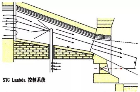 SGT空氣幕系統(tǒng)提供了工具設(shè)備來控制助燃空氣,其流動分布的情況如圖11所示。同時,該圖也展示了小爐中空氣幕系統(tǒng)的功能與安裝形式。小爐中使用的壓縮空氣幕墻通常顯示過量空氣,并且將一部分預(yù)熱助燃空氣轉(zhuǎn)向輸送至相鄰的小爐中。工作氣流量與被控制氣流量之間的比例會因小爐的設(shè)計(jì)而不同。一種典型的應(yīng)用比例是1:10,這意味著用l0Nm3/h的工作氣流就可以控制l00Nm3/h 的熱氣流到相鄰小爐中。工作氣流的用量是很低的,所以對位于下游蓄熱室大碹的Lambda測量系統(tǒng)沒有太大影響。該空氣幕系統(tǒng)隨著點(diǎn)火循環(huán)而開關(guān),其唯一原因是節(jié)省壓縮空氣。