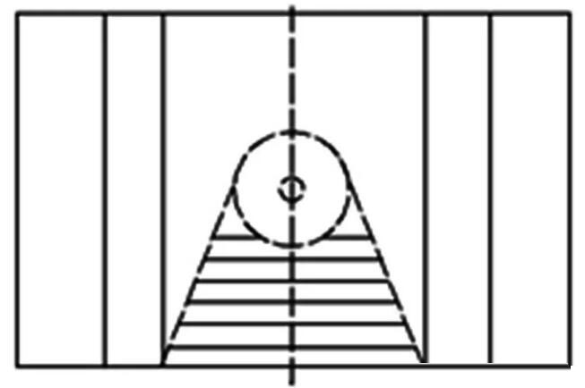 國(guó)外發(fā)明了一種供料道底部泄料裝置,它在供料道底部有一道槽溝,槽溝中央有一個(gè)泄料孔,見(jiàn)圖一,或在供料道底部有一道弧形裝置,弧形裝置頂端有一個(gè)泄料孔見(jiàn)圖二。不管是圖一還是圖二中的料槽磚,其內(nèi)側(cè)底角不要形成直角,最好是弧形斜面。這樣可以去除死角,使料道底部的臟玻璃移至放料點(diǎn)[3]。變質(zhì)或被腐蝕物污染的玻璃流進(jìn)料盆之前,先進(jìn)入這道槽溝里從泄料孔底部排泄掉,從而有效解決因侵蝕物進(jìn)入料盆而產(chǎn)生的條紋。其詳細(xì)機(jī)理,請(qǐng)參照華東理工大學(xué)博士生導(dǎo)師孫承緒教授寫的“料道電加熱放料機(jī)構(gòu)”一文。