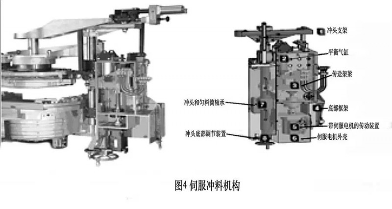 伺服電機通過沖頭傳動軸驅動沖頭臂支撐架梁,傳送架梁帶動沖頭主軸上下往復運動,由限位開關分別限定往復運動的高位和低位。通過架梁傳送給沖頭的行程運動,可有效避免附加給沖頭和勻料筒的彎曲力和橫向力(圖4)。