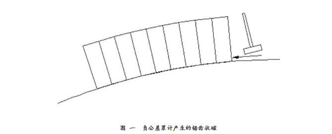 在爐蓋的砌筑過程中,我們也走過一些彎路,初期要求磚縫小,就不管磚的大小頭弧長是否符合比例,一味要求將磚與磚之間敲緊。若磚體的上部尺寸都是負公差,那么在碹磚砌筑過程中,負公差累計而產(chǎn)生鋸齒狀(圖一)。