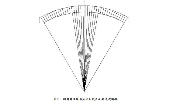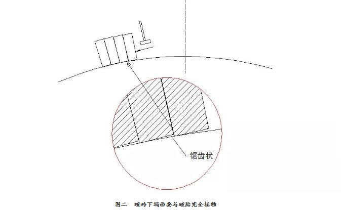 即該種碹磚磚縫形成的射線是不會通過圓心的,這種狀況的爐蓋在烘烤的過程中容易產(chǎn)生不規(guī)則而且較大的裂紋。而我們現(xiàn)在的作法是,在砌筑時,要求碹磚小頭的下端面整個底面一定要跟碹胎靠緊(圖二),在確保碹磚底面與碹胎靠緊的情況下主要敲下部,以確保每條磚縫的射線延伸線都通過圓心(圖三),這樣砌筑的爐蓋使用8~10年完全沒有問題。