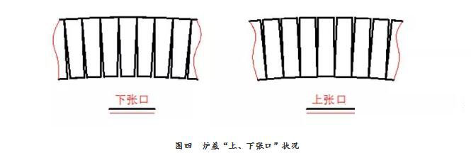 這種做法當時也是沖擊我們的傳統(tǒng)思維及行為準則的事,參觀時我們非常困惑,萬一爐蓋發(fā)生碹磚“抽簽”掉磚現(xiàn)象怎么辦?!事后我們經(jīng)歷了反復比較,也將其原理想通了,爐蓋在冷態(tài)保溫后,爐蓋在烤窯的過程中內(nèi)外溫差小,上下膨脹均勻,這樣反而不容易發(fā)生碹磚“抽簽”掉磚現(xiàn)象(我認為用“打漿法”砌筑、磚縫較大是前題條件)。而我們“熱保”,雖然烤窯時爐蓋上也蓋了纖維氈,但是畢竟保溫較薄,上下溫差很大。特別是將纖維氈揭開清掃爐蓋后,爐蓋內(nèi)外溫差上1000~1200度。在這種狀態(tài)下將爐蓋保溫層做好后,爐蓋表面溫度會迅速升高,外端部(外弧線)會發(fā)生較大的膨脹量,而內(nèi)端面整個膨脹基本到位,外弧的膨脹量應該是讓上端面的裂縫來吸收,但是這些裂縫被石英砂粒或硅質(zhì)耐火泥填充掉了,若此時松頂絲、爐蓋可能形成“下張口”見圖四。