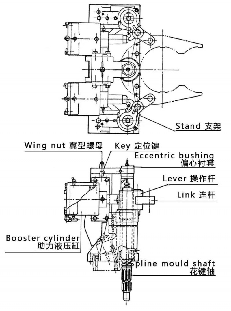 ⑴ 結構基本上與初型模抱鉗機構相似,主要由支架、抱鉗、定位心軸、聯桿、搖臂、花鍵軸等組成。整個機構也由六個螺絲固定在機組框架頂部。不同之處有:① 無助力氣缸;② 采用擴張式花鍵軸;③ 機構支架還支承口鉗機構。