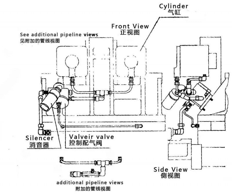 ⑶ 在初型模支架兩旁各裝有一個助力氣缸,其作用是增加初型模的夾緊力。助力氣缸為雙作用單出軸氣缸,雙向進氣由一個配氣閥配氣,配氣閥的低壓操作空氣由閥箱氣室6#氣路上的壓蓋引出,配氣閥控制氣路由閥箱4#氣路引出,在引出的管路上有一個調節閥,以控制助力氣缸的配氣速度。氣缸兩端均無終點緩沖裝置,以配氣閥引至兩氣缸出桿端的驅動氣路上設有一個調節閥,它既控制助力氣缸在活塞桿伸出時的排氣速度,又控制活塞桿縮回時的進氣速度,從而達到雙向行程的控制,如圖13-2所示。