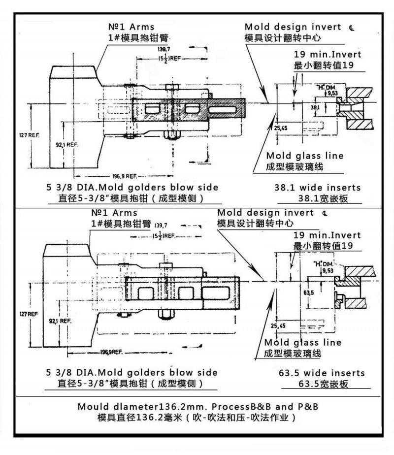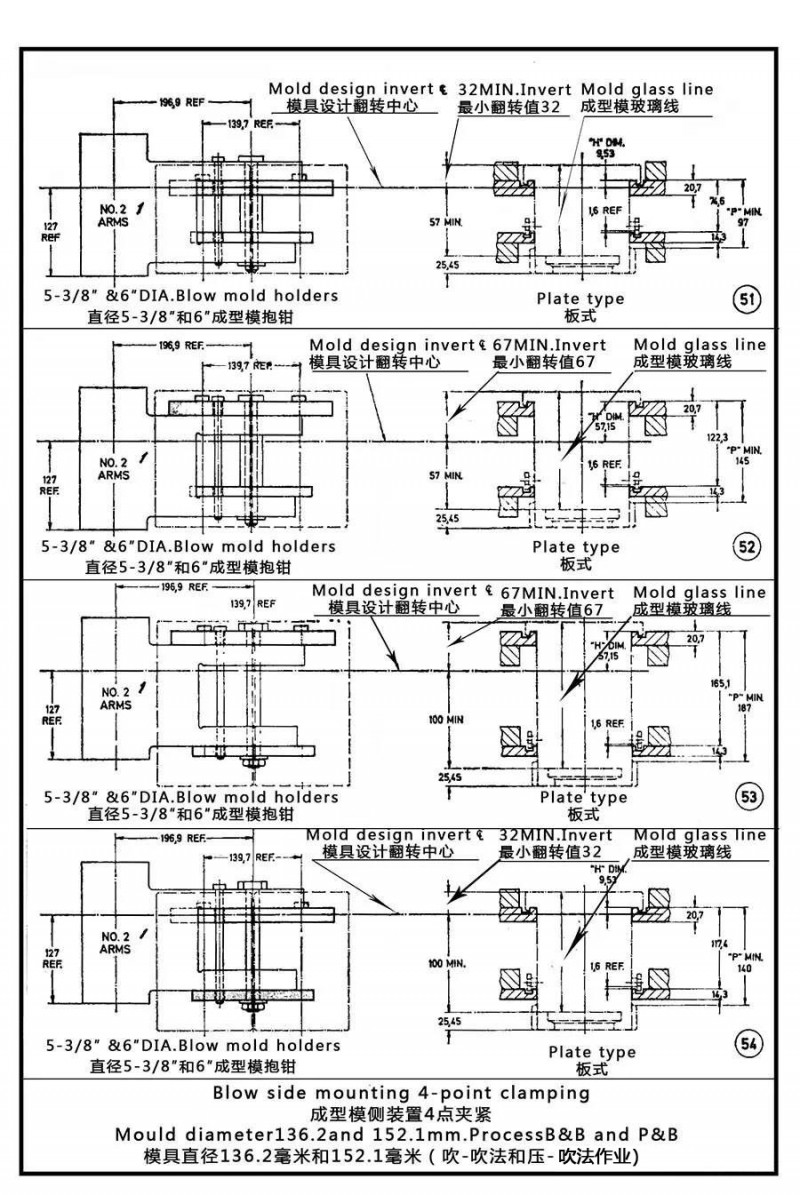 在安裝方式圖中,圓圈內的編號是用于5-1/2英寸中心距制瓶機模具的安裝件;方框內的編號是用于4-1/4英寸中心距制瓶機模具的安裝件。