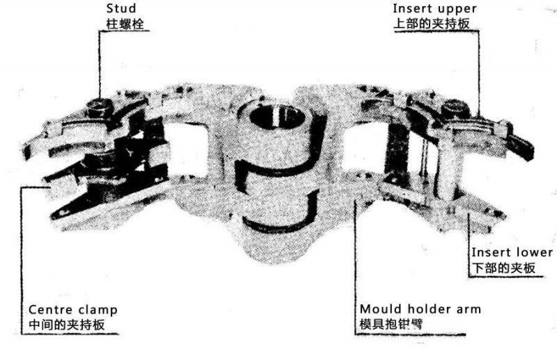 雙滴料模具抱鉗是插在模具支承機構的鉸鏈銷上。雙滴料模具抱鉗包括有兩個鉸鏈臂,該臂支承著實際的抱鉗或鉗板。模具抱鉗臂的鉸接方式與單滴料模具抱鉗相同。每一鉗板用一個柱螺栓固定在抱鉗臂上,并允許鉗板繞此螺柱栓有些活動,使得在兩個模具上的閉合力達到完全的平衡。模具是卡裝在鉗板的圓柱表面,其上部的子口正放于鉗板的上部表面上。在鉗板上有一個方形鍵塊正卡在模具的缺口里,用來防止模具轉動。