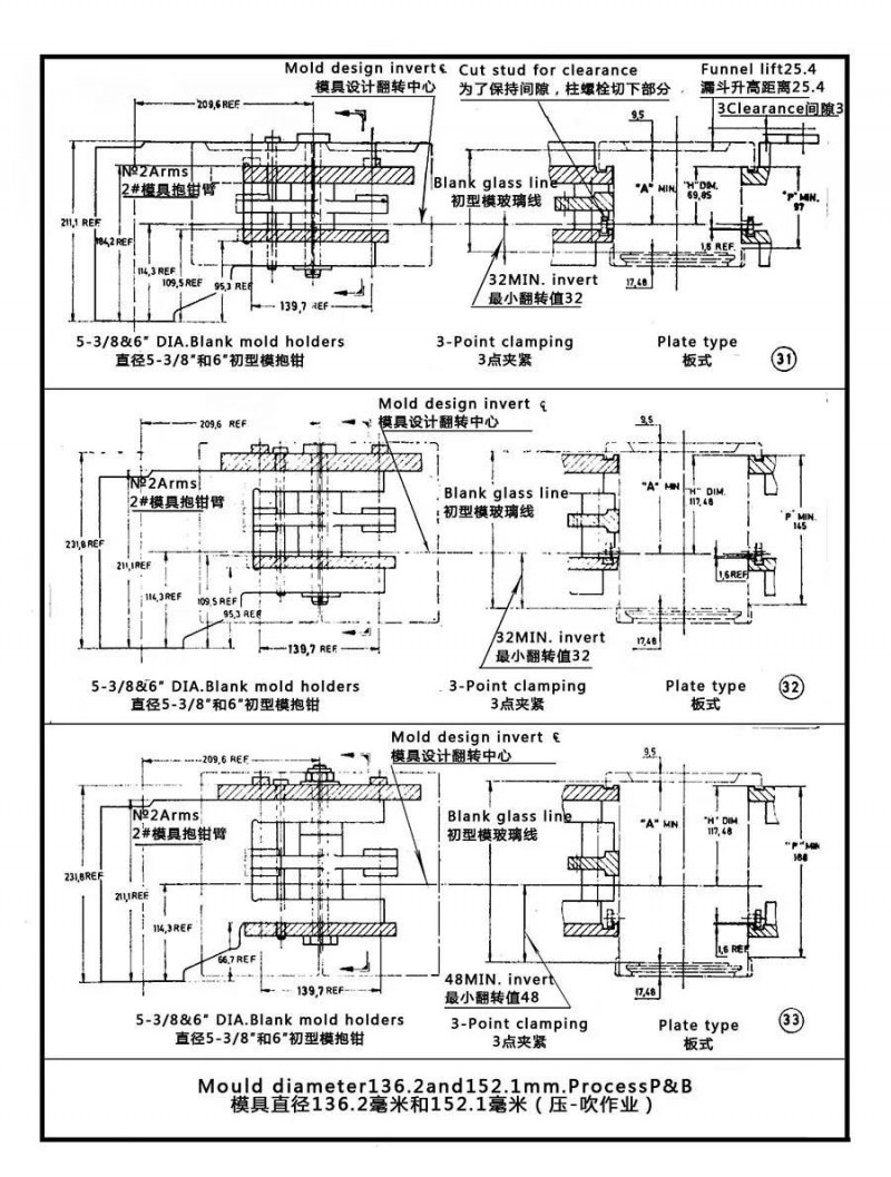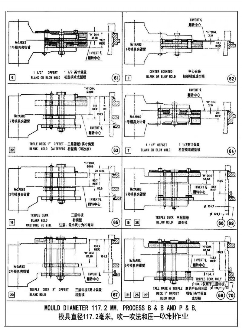 此制瓶機可以使用4-1/4英寸中心距的模具,但需配用相應的夾持板,圖13-10列出適用于4-1/4英寸中心距制瓶機的模子夾持板。