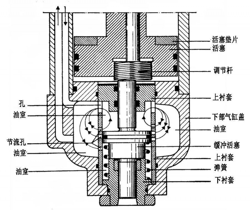 當齒條活塞下降時,其下部的調節絲桿碰觸緩沖活塞,迫使它隨即向下移動,并擠壓油室中的油流出,油通過節流孔進入油室,再由油室通過孔進入另一油室。