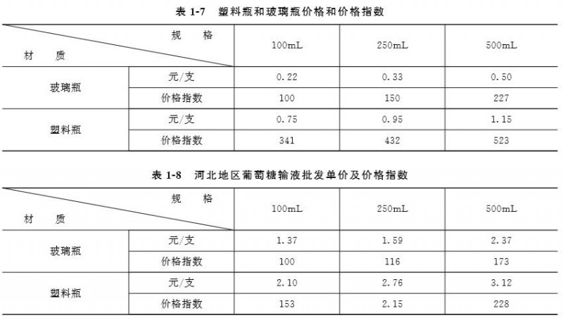 從表1 7和表1 8數據可以看出,相同規格的醫用輸液瓶、玻璃瓶與塑料瓶的差價為0 .50~0 .65元;相同規格的葡萄糖輸液不同包裝的差價也在0 .70~0 .75元。