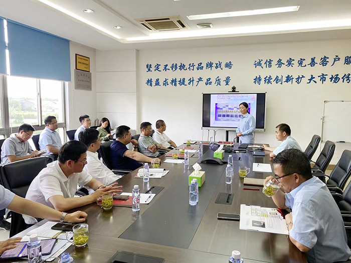 秦市長等一行領導首先觀看了精工模具的宣傳片,隨后總經理趙蘭英介紹了公司在智改數轉方面取得的成績:榮獲“江蘇省工業互聯網標桿工廠”、“江蘇省智能制造示范車間”、“江蘇省四星級上云企業”、“兩化融合貫標AA級”、“國家專精特新小巨人企業”等認證和榮譽,秦市長對精工模具通過“數字化、智能化轉型,實現高質量發展來搶占未來玻璃模具產業競爭制高點的戰略選擇表示了肯定。